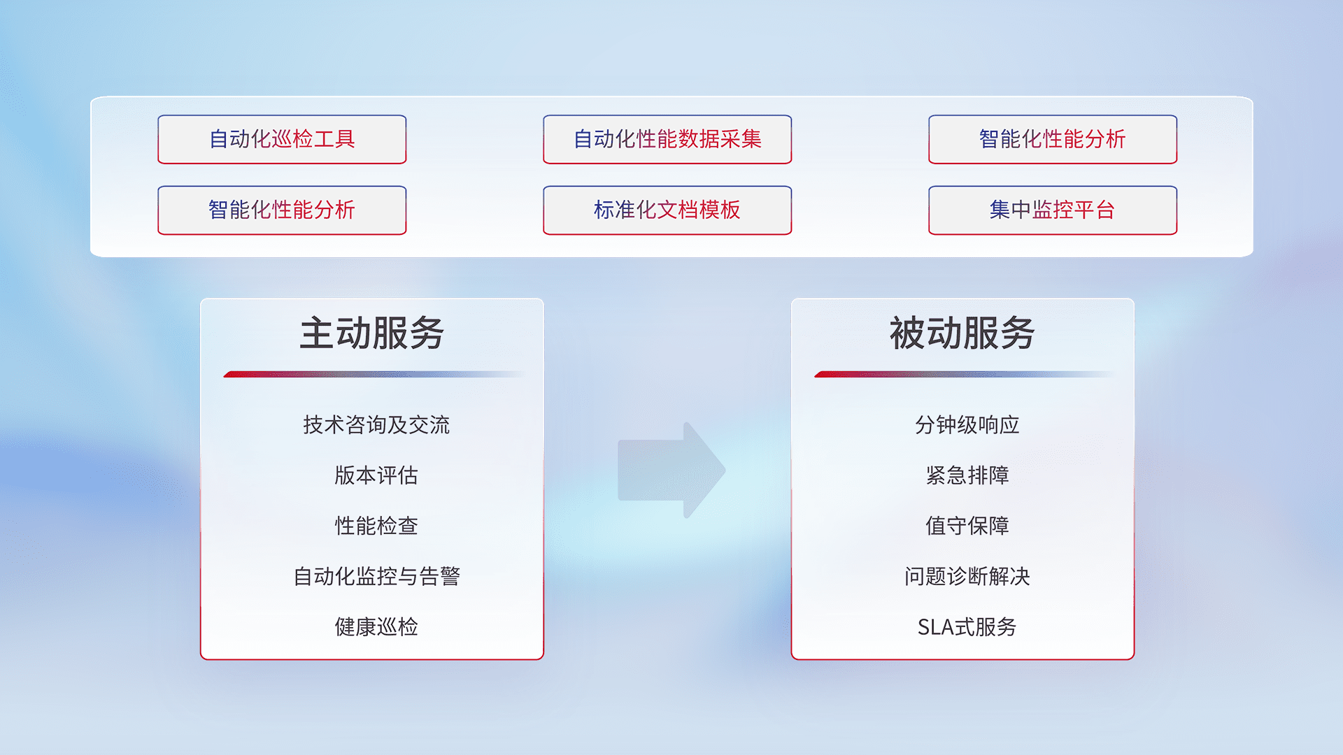 智能化工具和标准化文档,,,,保障服务质量,,提供主动服务(包含技术咨询、、、、版本评估、、、、性能检查、、自动化监控与告警、、、健康巡检)和被动服务包含(分钟级响应、、紧急排障、、、、值守保障、、、问题诊断解决、、SLA服务)。。
